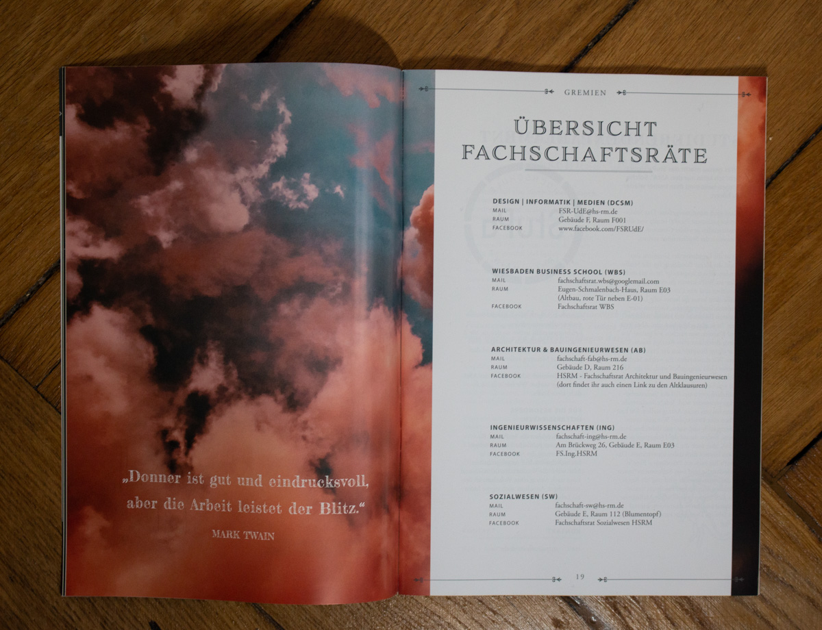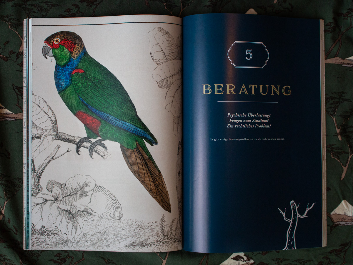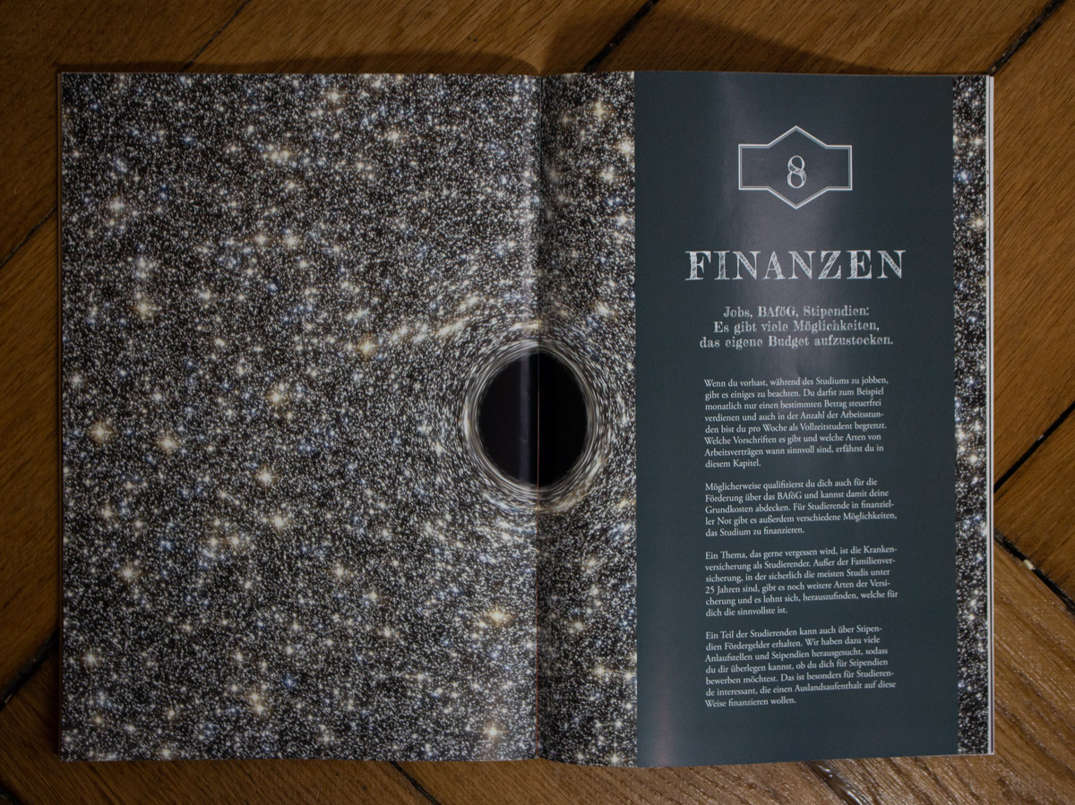 Eine der größten Aufgaben dabei war zu jedem Semester ein Info-Magazin für Erst-semester mit mehr als 100 Seiten neu zu gestalten und zu layouten. Für jedes Magazin wählten wir ein visuelles Thema, welches dann von Cover über Bildwelten und Farbgebung hin zu Typografie pro Semester neu umgesetzt wurde.